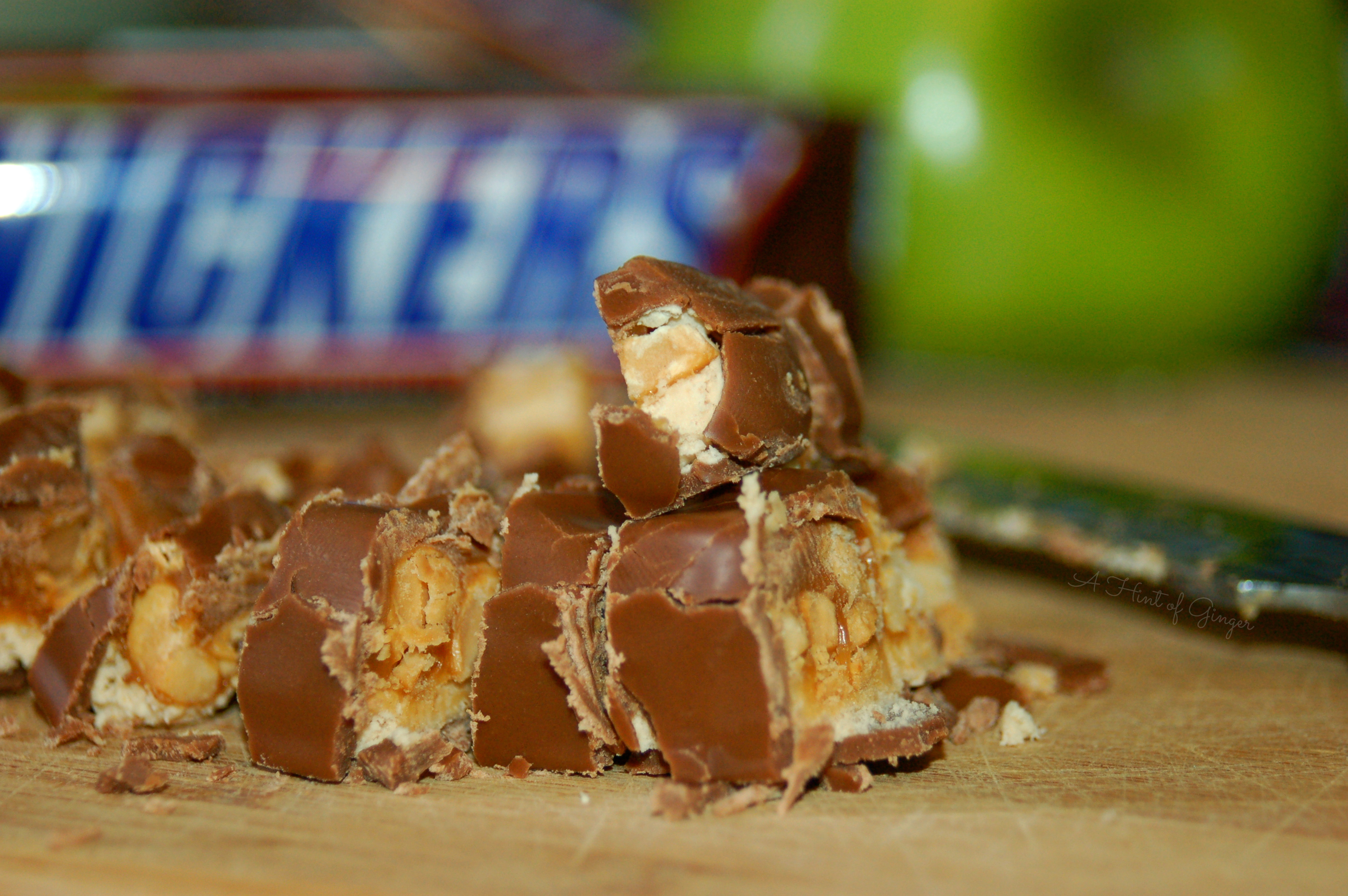 - Chop up apples and Snickers into bite-sized pieces and mix into pudding mixture. Keep a handful or so of the chopped up Snickers to add to the top of the dish for garnish.