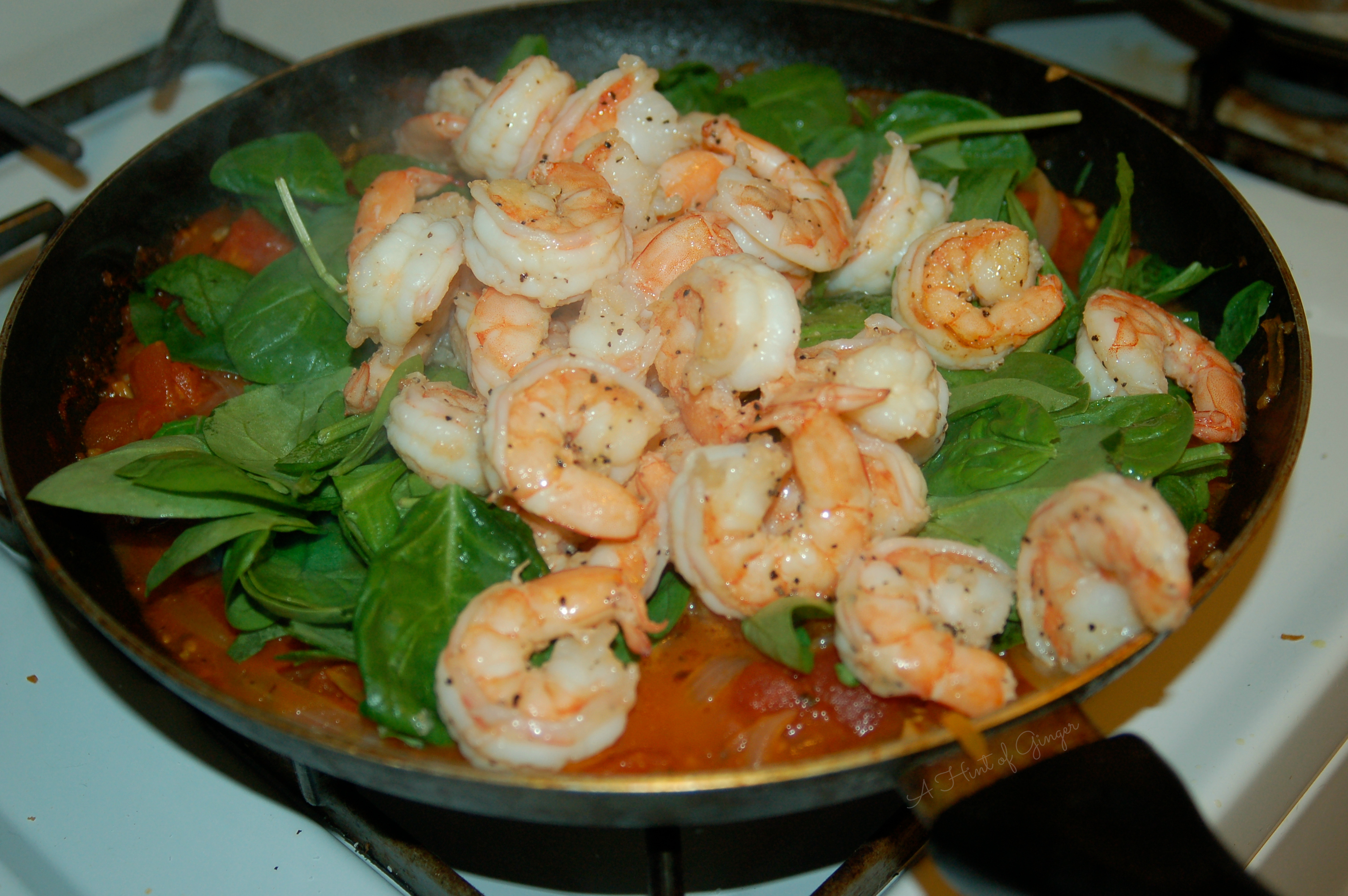 - While heating the sauce mixture, add 1 tablespoon of butter and 1 tablespoon of olive oil to pan and heat over medium heat until butter has melted and is bubbling. Add shrimp and season with salt and pepper. Flip shrimp to ensure it gets cooked all the way through until shrimp turns pink all over. Add shrimp to sauce mixture after you have added spinach.
