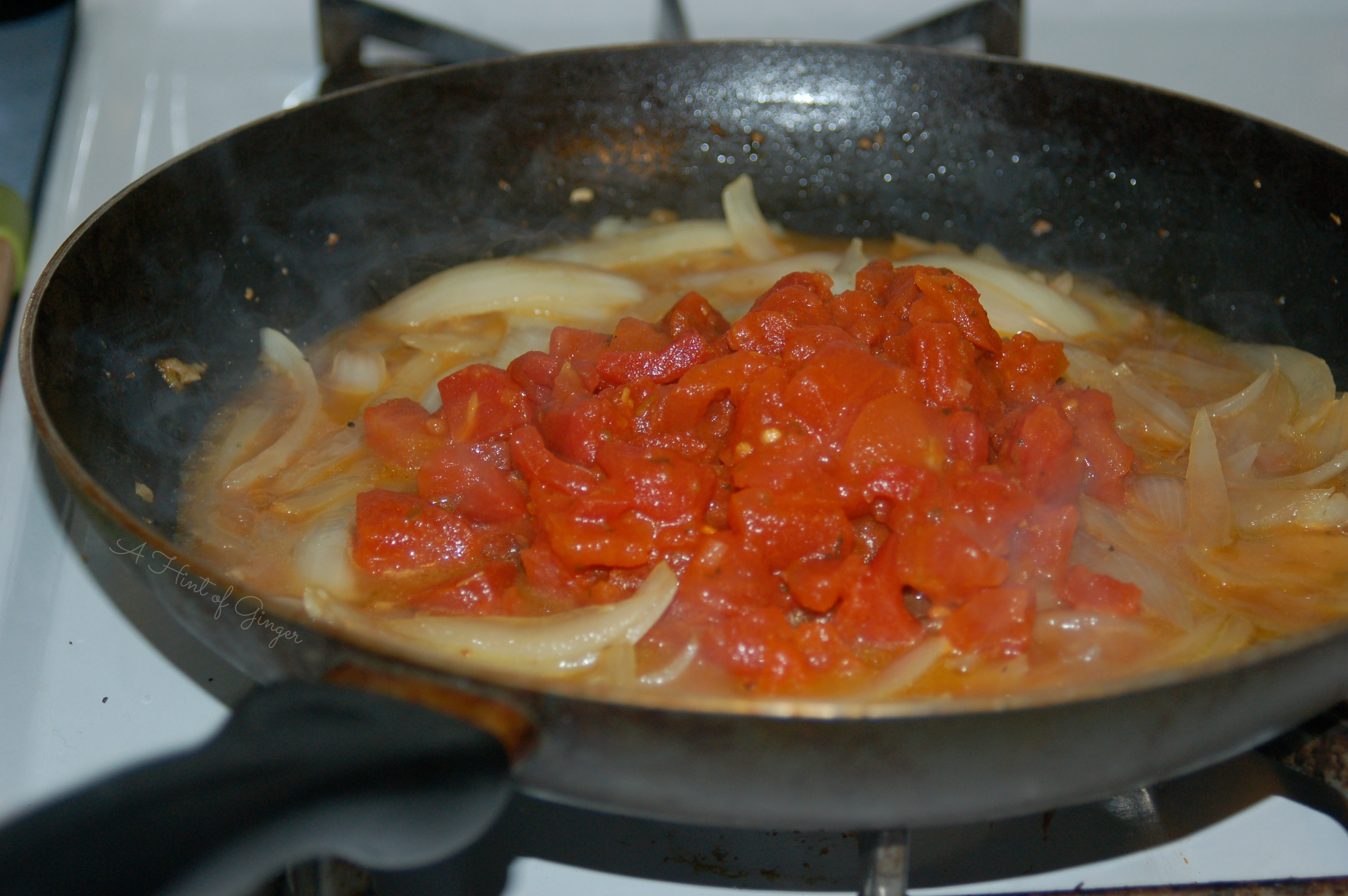 - Meanwhile, heat 2 tablespoons of olive oil in large skillet pan over medium heat. Add garlic and saute until fragrant but not yet golden in color. Add onions and sauté until softened then add chicken broth, using only about 1/4 of a cup or so at first. Reduce broth down for a few minutes. Add can of diced tomatoes as well as salt and pepper to taste then stir together. Continue to heat mixture over medium to medium-low heat until just before your pasta is done. Add spinach and stir to wilt and mix together.