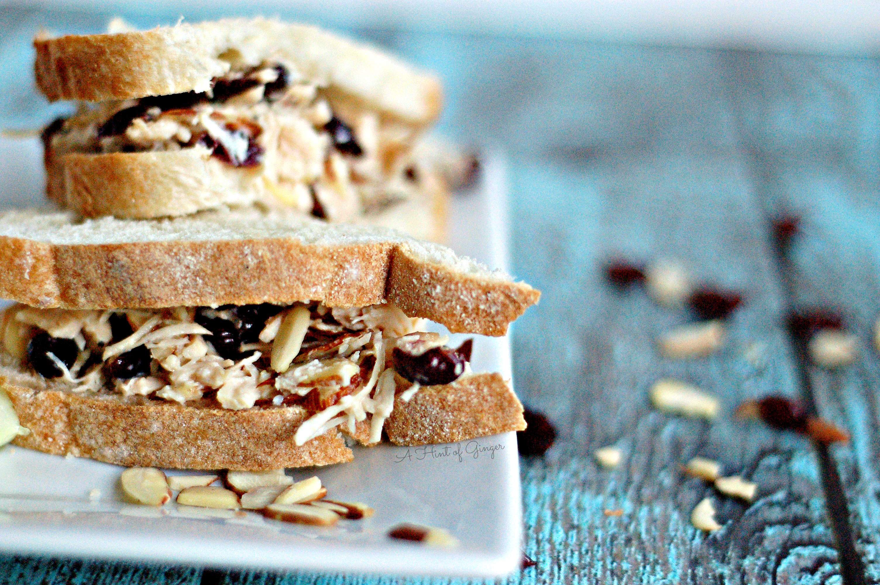 During a visit back to the U.S. in August, I got to spend the day with a friend of mine and meet her son for the first time. As we caught up, we enjoyed a lunch of chicken salad and chips. I realized somehow I had never tried chicken salad before, but I loved this recipe and realized it was something that I could easily make and have on hand for quick lunches. Last weekend, we dusted off our bikes and went for a ride around our neighborhood. Afterward, this sandwich sounded like the perfect lunch to have and it was. The best thing is that in making one batch, you have additional servings ready for another day of the week. This is one of those recipes that you can really add whatever you want into it or switch out ingredients; apples, walnuts, etc.